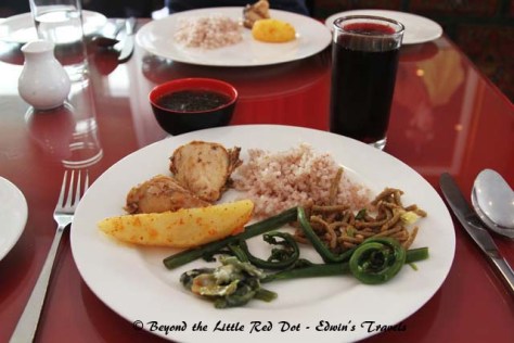 A typical Bhutanese meal which usually includes red rice, potatoes, chicken and their national specialty of chili cheese with vegetables. Bhutanese meals are generally spicy, so if you can’t take spicy food, you have to tell your guide so that he can arrange suitable food for you.