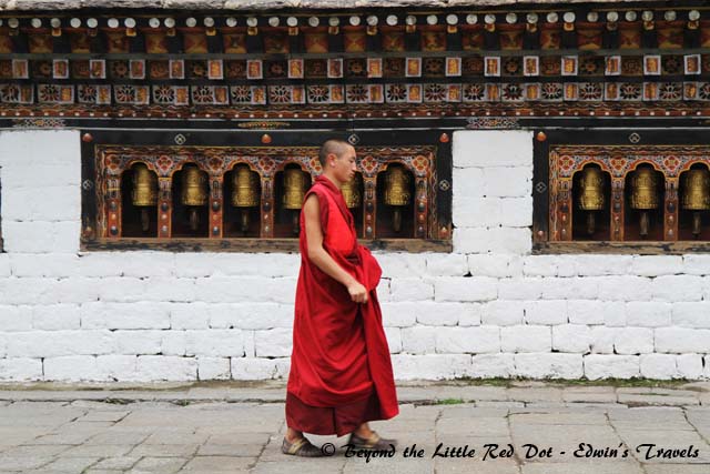 bhutan_monkDzongs (fortresses) are common and there are several famous Dzongs to visit. Several hundred years old, these fortresses are now converted to government offices and monasteries. Prayer wheels are commonly seen everywhere. Basically you will see the influences of Hindusim and Tibetan Buddhism. Photo taking is not allowed inside the worship halls and your guide will tell you when not to take photos.