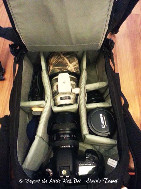 For leisure trips I usually bring my Lowepro Flipside 400AW backpack. It is large enough to store my Canon 7D DSLR camera with several lenses, cleaning gear, filters, spare memory cards, chargers. I can even squeeze an ultrabook computer into it. I like this backpack because of its security design which prevents theft of your camera gear.
