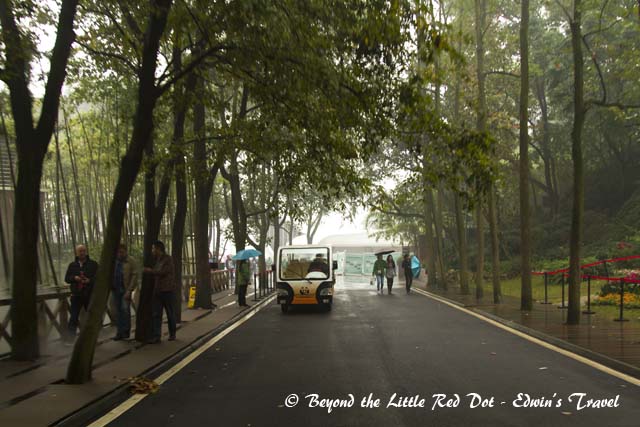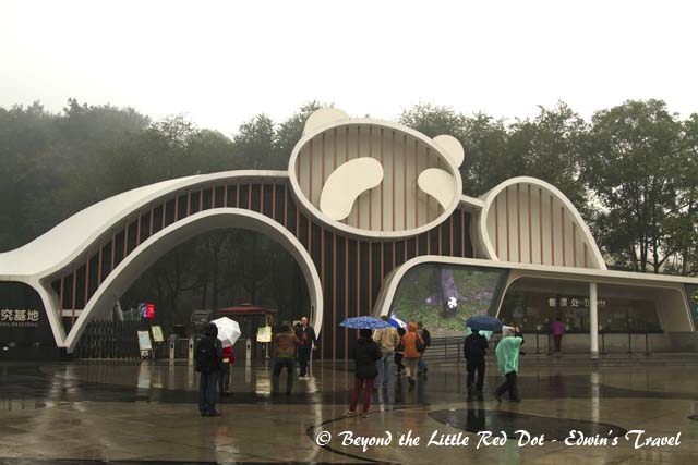 As Chengdu (成都) is famous for its giant pandas , I made it a point to visit them. The next morning, I took a taxi to the Giant Panda Breeding Research Base. Unfortunately it was a foggy and rainy day, but I had not much of a choice since I only had the morning free before my Chinese colleagues would meet me in the afternoon and drive me to Leshan. So I arrived very early at the main entrance at 8.30am just after they opened their gates.