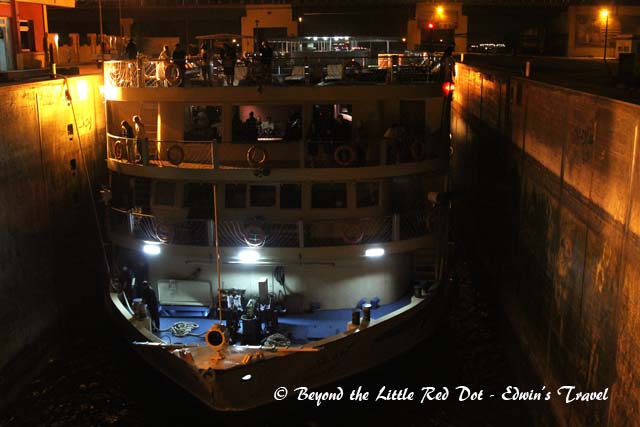 Each lock can accommodate up to 2 ships. The water level in the lock is now low since we are on the lower side of the river.