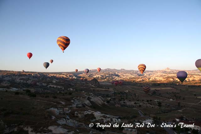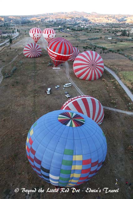 Preparing the balloon for flight.Blasting hot air into the balloon.We were the first to take off and had a good view of the rest of the balloons.You can see the ancient houses that are carved from the mountains.The sky was filled with balloons as the sun started to rise.Looking at the fairy chimneys that make Cappadocia famous.After around 1 hour of flight we landed bumpily. We were given certificates for completing the flight and had champagne to celebrate.