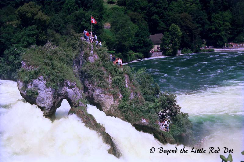 The main attraction of the Rhine Falls is to take a boat to a large rock outcrop in the middle of the waterfall and experience the rush of tons of water thundering by.