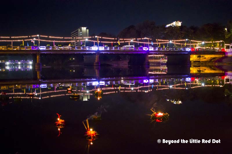 Lighted krathongs sail down down the Ping river. The city was also lit up for the festival.