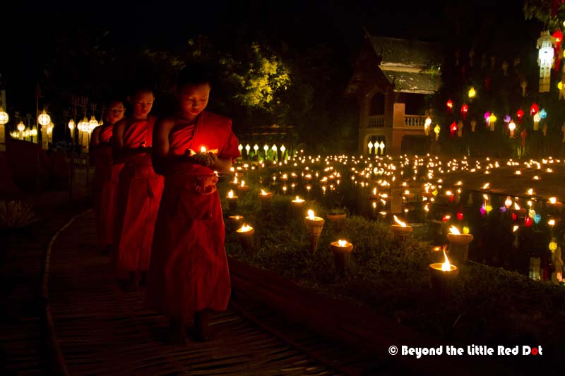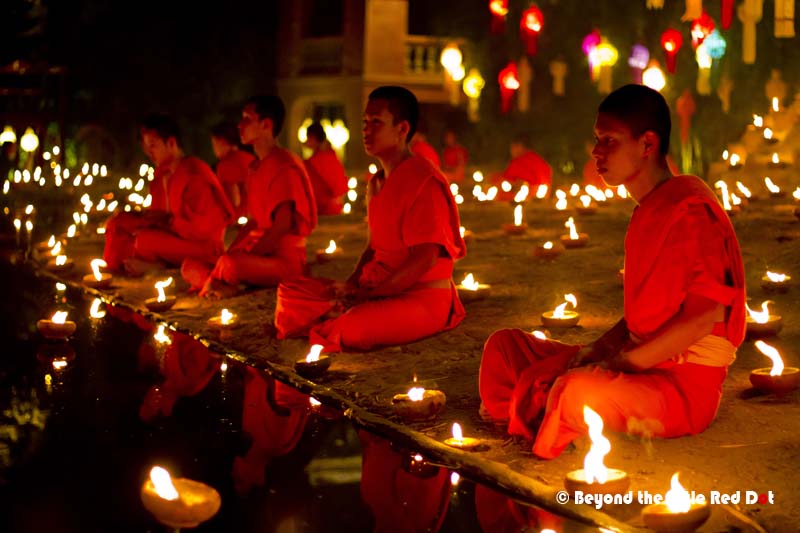On the eve of Loy Krathong, the temples in Chiangmai were already starting their ceremonies associated with the festival. Monks were busy preparing the temple grounds with lights, incense and offerings to Buddha. One of the more well known temples for such ceremonies is Wat Phan Tao which  is located just next to Wat Chedi Luang, the main temple in Chiangmai. Their meditation ceremony is well known and attracts lots of visitors.
