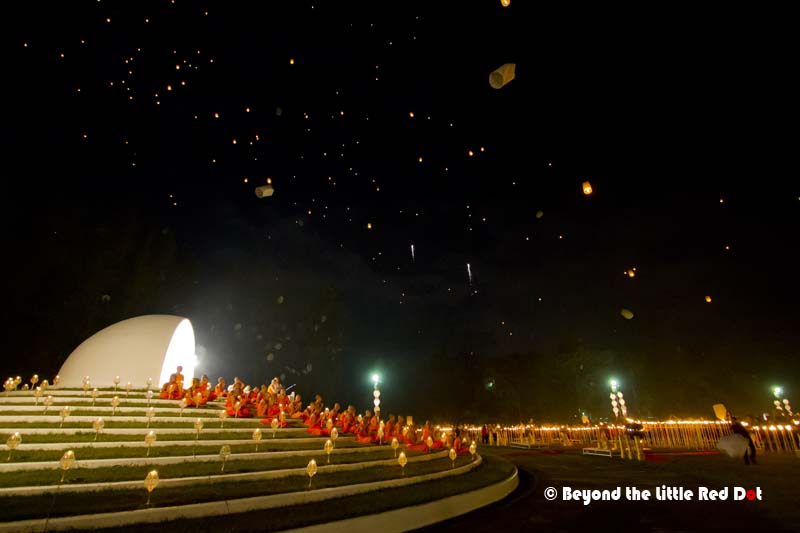 Every year the release of sky lanterns poses a risk to aircraft and are also a potential cause of fire hazards when they fall to the ground. Although there have been no aviation accidents due to the sky lanterns, there have been enough close calls for the Thai authorities to restrict the releasing of sky lanterns in 2015. Usually, there are 2 major releases of the sky lanterns during Loy Krathong. The first release is during Loy Krathong itself (free entry), and there is a second release 1 week later which is for tourists and is a paid event. But for 2015, the Thai  authorities only allowed the mass release during the paid event which was held on Loy Krathong day itself. So for us, we had to go the paid event which is held at Mae Jo north of Chiangmai. This event is organized by a Buddhist sect and is targeted at tourists.