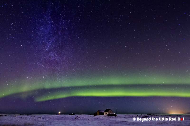 Looking southwards and the bright lights are Keflavik Airport in the distance. The Milky Way can still be seen dimly, although the Northern Lights were getting brighter and starting to block out the stars.