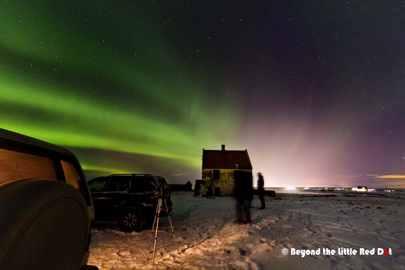A behind the scenes shot. The SUV’s which brought us here off-road, somewhere on the Reykjanes Peninsular between Reykjavik and Keflavik Airport, near the coast. In the middle of nowhere with only an abandoned house and the distant lights of Reykjavik on the horizon to remind us that civilization is still nearby. Temperatures were around -5°C that night.