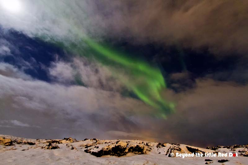 Our first night to catch the Northern Lights and we were in luck with clear skies. In reality, the lights were really dim and looked like moon lit cirrus clouds with a hint of green. It’s only when our eyes got accustomed to the dark that we could see them slowly changing shape. This place was really dark and the Milky Way can be seen on the left. The Northern Lights look more intense in the photo due to long exposure times and sensitivity of the camera’s sensor.