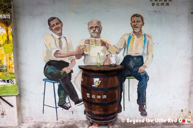 You have to look for the street art murals amongst the old shophouses. Some of them are also interactive like this one where you can sit by the barrel and have a beer with the 3 guys.
