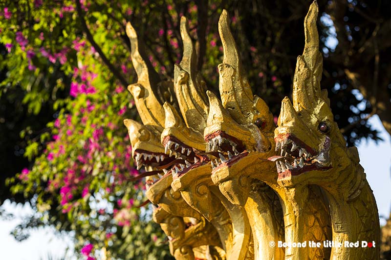 One of the main features of Laotian temples are the 9 headed Nagas which are the guardians of the temple. You will find them adorning the stairs of many temples, guarding the way in.
