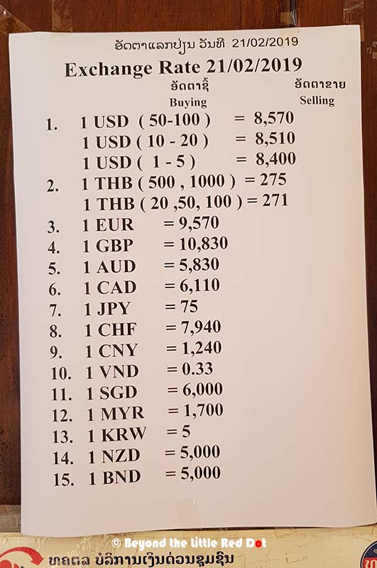 There are also ATM’s around town where you can withdraw Kips using your ATM card. Do take note of the exchange rates and transaction fees though.