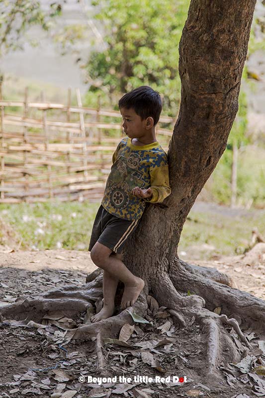 This boy was leaning on a tree and watching the commotion created by our visit.