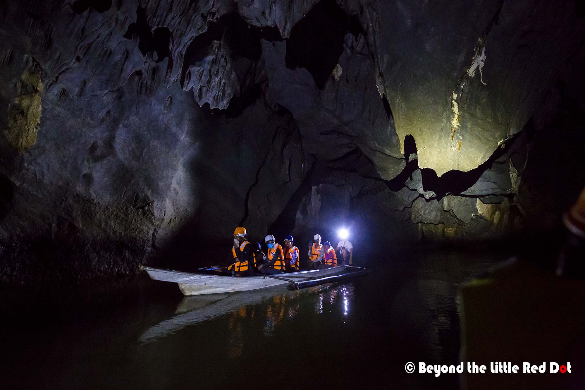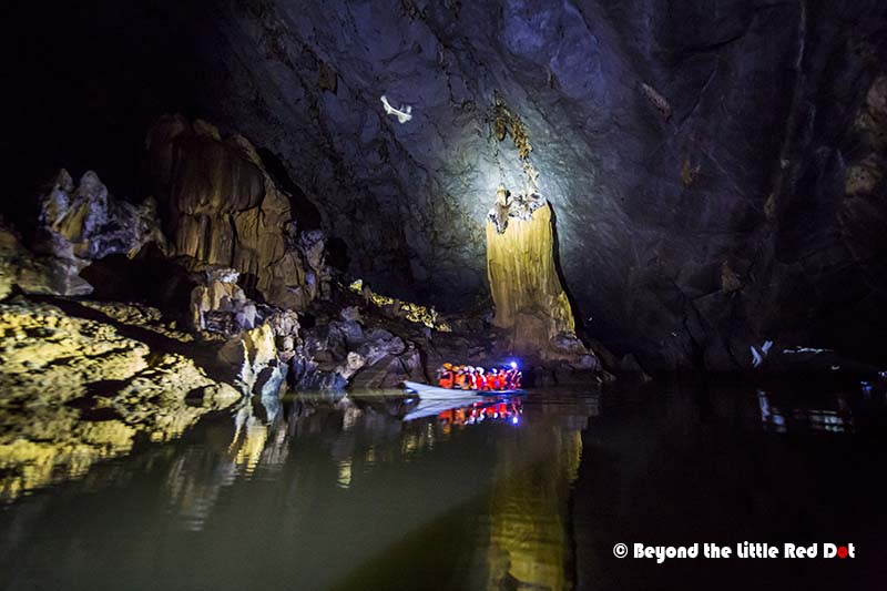 In order to preserve the ecology of the PPUR, no excessive noise is allowed in the caves. So each one of us was given a personal audio device which narrates interesting facts about the PPUR through an earphone.And so we head towards the cave entrance of the PPUR. The smell of guano, or bat poop hits us in the face. If you need to puke, now is the time to do it.As we went further into the cave, it gradually got darker until it was pitch black. The only light was from the head mounted torch of the boatman. He would shine his torch at prominent landmarks as pointed out by the narration from the audio device. I wondered how he could sync so well with the audio narration. Did he have his own audio device or he just knows it from pure memory?And we could see the millions of bats which make the caves their home. As we were warned in the audio narration, we had to keep our mouths shut as we looked up or risk getting a mouthful of bat guano. Besides bats, swiftlets also make these caves their home.Most of the time, we were paddling through low rocks and narrow passages…But there are a couple of large caverns with ceilings as high as 60m above us. The sight of giant stalactites and stalagmites is quite impressive. Finally we came out of the underground river back through the same opening that we had entered. The tour lasts for around 45 minutes and we had traveled around 2km or more of caves. The PPUR itself is thought to be 24km long, and only 8km of it has been explored.