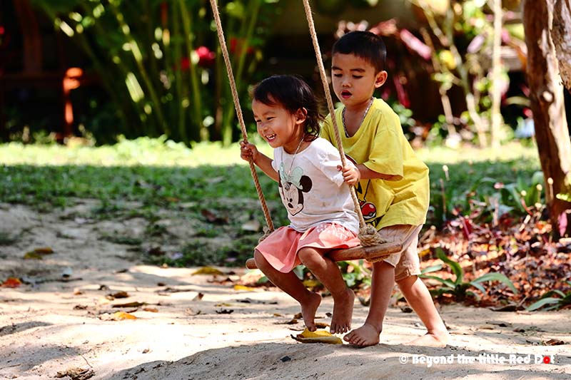 A pair of siblings playing on a swing as they enjoyed the coolness from the nearby waterfall. We have the big brother giving his little sister a push on the swing.