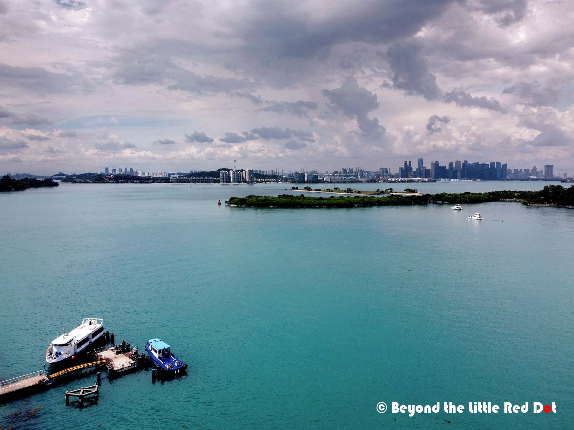 A drone shot of the jetty at St John’s Island and with the city skyline of Singapore behind, reminds us that we haven’t left the country.
