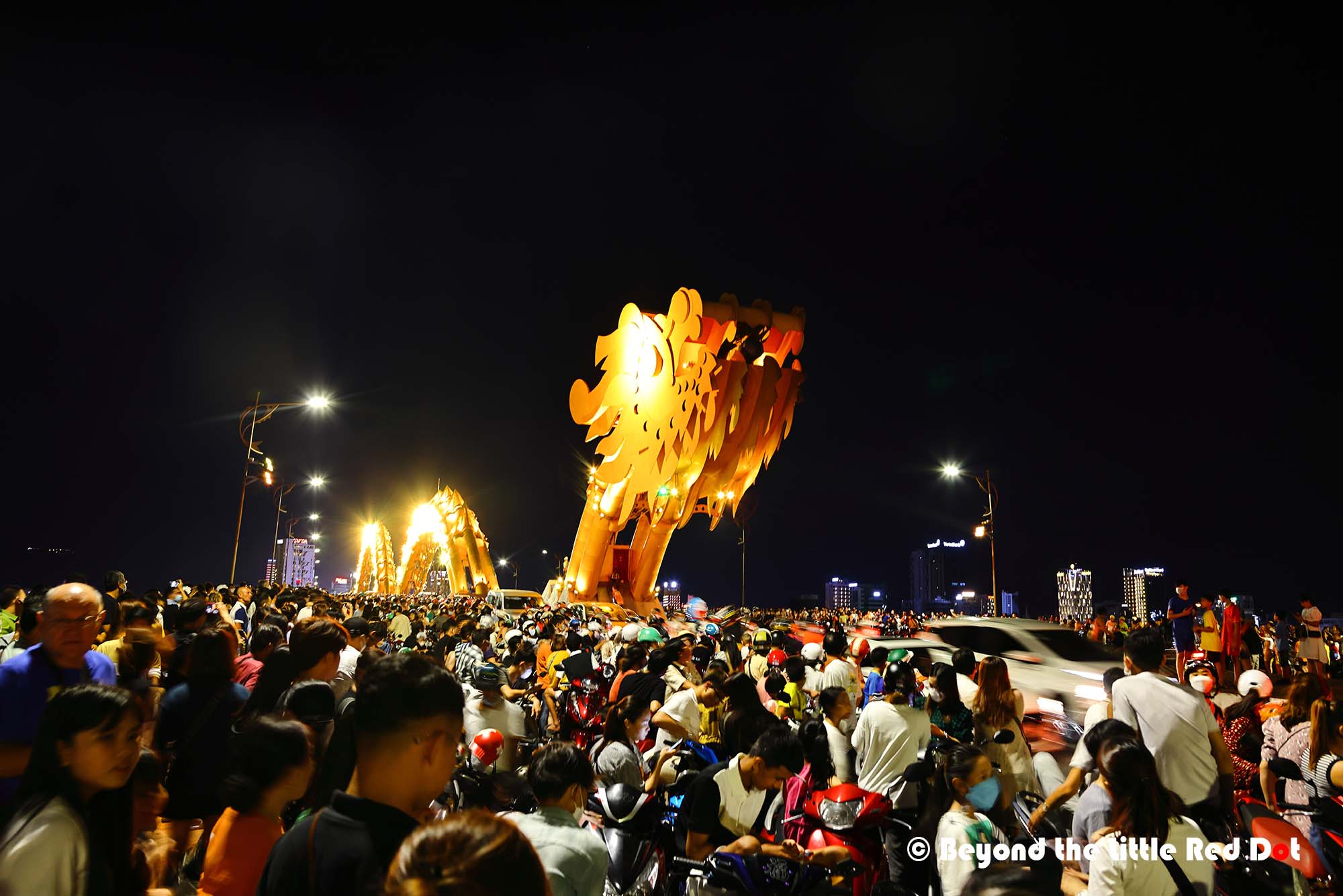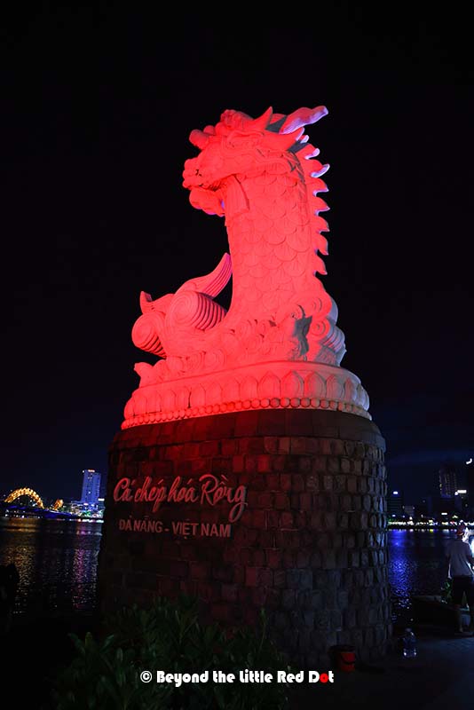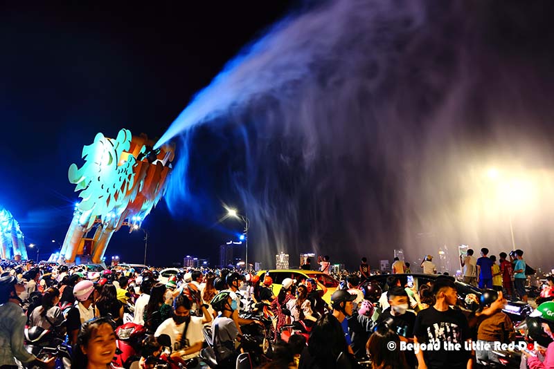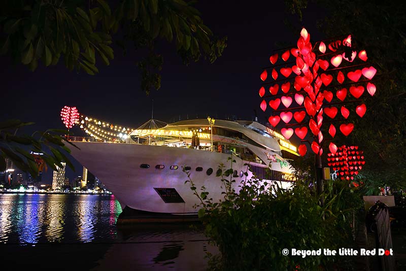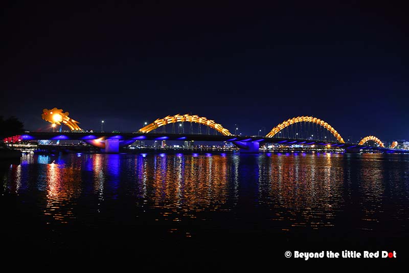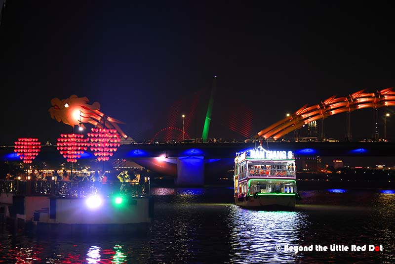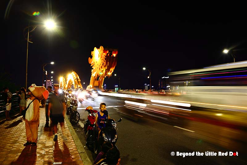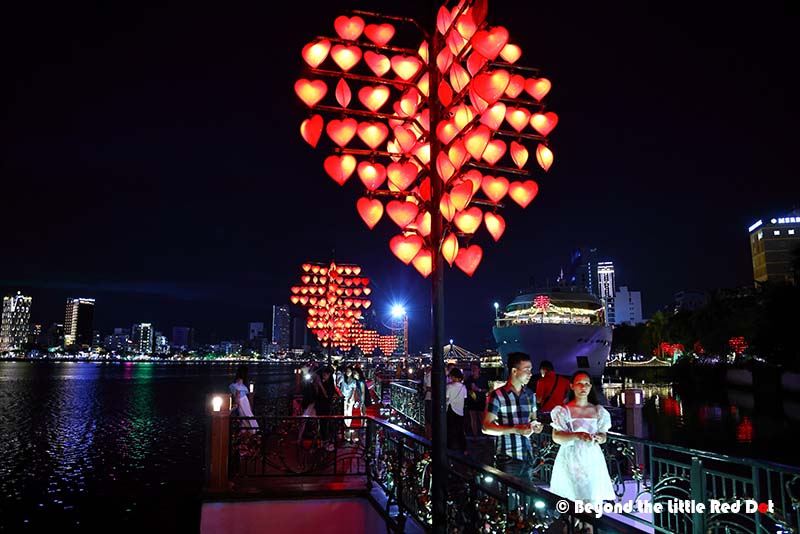 The Dragon Bridge looks especially beautiful at night because of the changing colours of the lights along it’s body.A good lookout point is the Lover’s Bridge located near the head end of the Dragon Bridge. You can see this statue which somehow reminds me of the Merlion in Singapore.Somehow, every city has to have a Lovers Bridge. Besides the heart shaped lamps, you can buy love locks and lock them onto the railings of the bridge to declare your undying love for each other.I found myself coming to this building which is built like a cruise ship. There is a restaurant here which I got myself a dinner and a view of the river and city lights.The night scene along the Han River is rather nice.By 8pm I had made my way up to the bridge. It was already getting crowded with people waiting along the sides of the road for the show to start. The fire breathing only happens at the dragon’s head. Duh! So don’t go to the tail end.By 9pm the whole bridge was jam packed with people. And traffic had come to a near stand still as the 3 lanes on each side of the bridge had reduced to a single lane with mostly motorcycles parked along the side.So the dragon does really belch fire. There were several rounds of fire breathing which raise the excitement of the crowd.Followed by a few rounds of water spraying out of the dragon’s mouth. The spray does travel really far and depending on the wind direction, you could get very wet. The Vietnamese consider it good luck to be doused by the dragon’s spit, so go get wet!