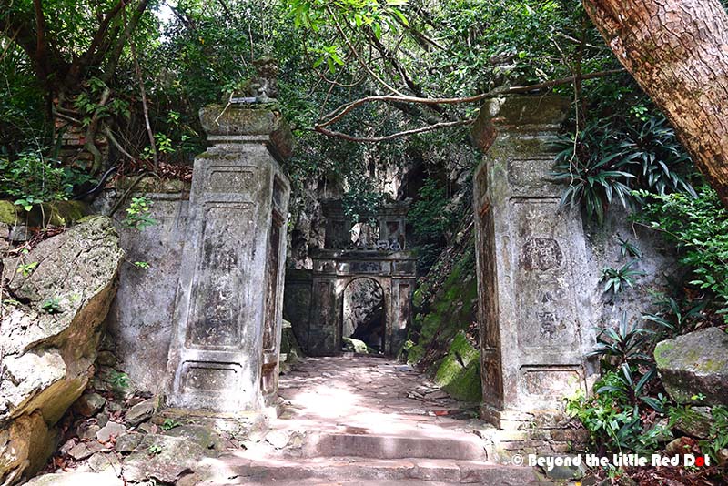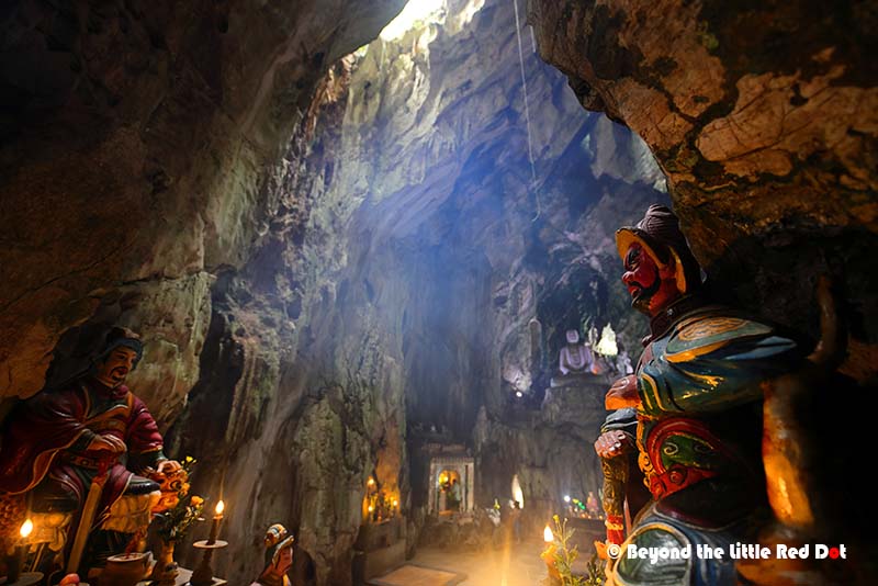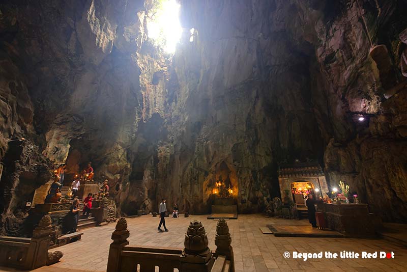 Even if you took the elevator to the top, there’s still a lot of climbing of steep stone stairs to get around.There are a couple of smaller caves serving as shrines.The main attraction is Huyen Khong Cave and here is the entrance to the cave’s mouth.It’s a large cave with holes in the roof giving it a mystical look with sunlight coming into the cave. If you come in the afternoon when the Sun is overhead, you can see beams of light shining into the cave.The cave can easily fit several shrines and a temple building in it. It was also very humid inside and my camera lenses were fogging up constantly.