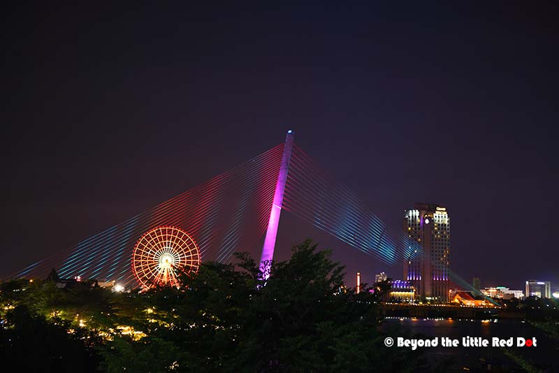 The huge Ferris wheel which can be seen day and night from almost all of Da Nang. This is how it looks from the Dragon Bridge at night.