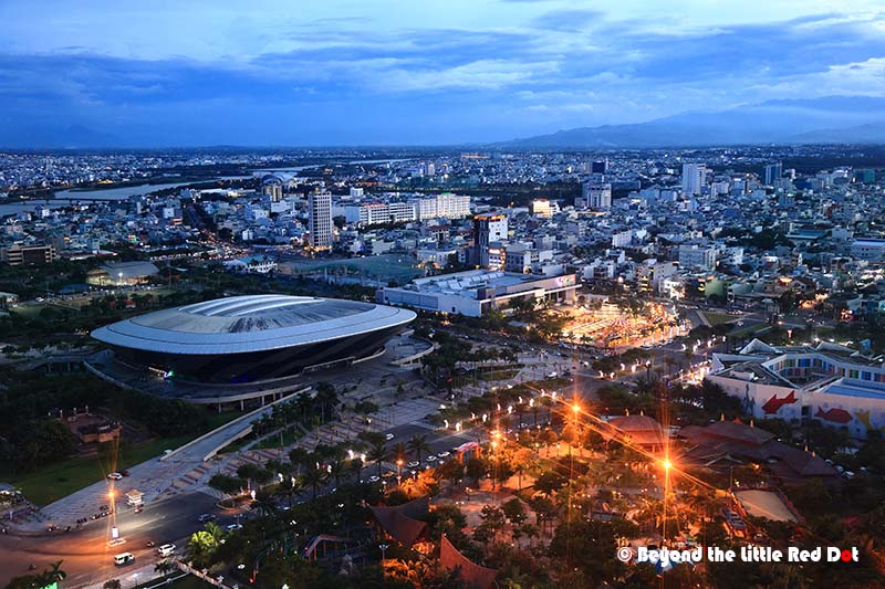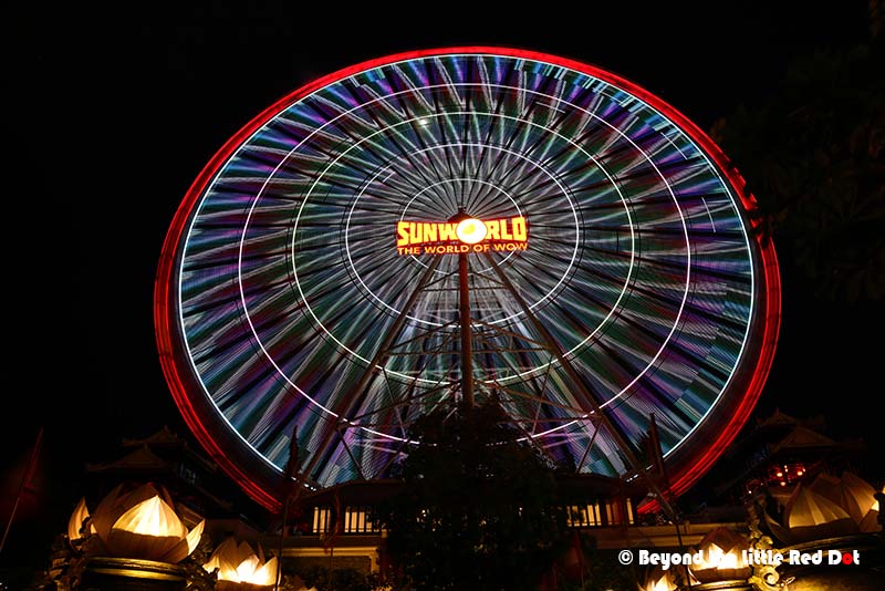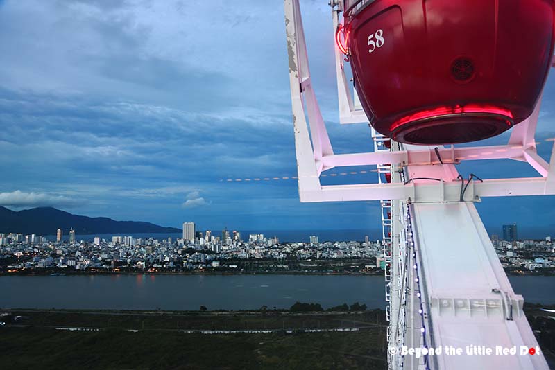 The most popular ride in the park is the Ferris wheel. It’s called the Sunwheel. It takes around 20 minutes for the full ride.I would say sunset is the best time to ride the Sunwheel as its not so hot, and you can get fantastic sunset views from the cabin. At the highest point, you will be around 115m above the ground which is around the height of a 25 storey building.Here are the Marble Mountains in the distance. They are another local attraction in Da Nang which I will touch on later.The local sports center and the brightly lit area to right of it is one of the local night markets called Helios Market where you can get some local street food.A view of the Han River with the many bridges that cross over, connecting the two sides of the city. You can see the Dragon Bridge in the middle.I managed to get a nice long exposure shot of the Sunwheel. It definitely looks much prettier at night.
