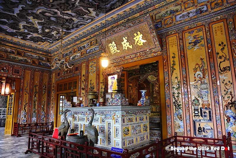 The main chamber where Emperor Khai Dinh’s remains are buried is a eclectic mix of Vietnamese and European styles and colours. It is a wonder to look at it.