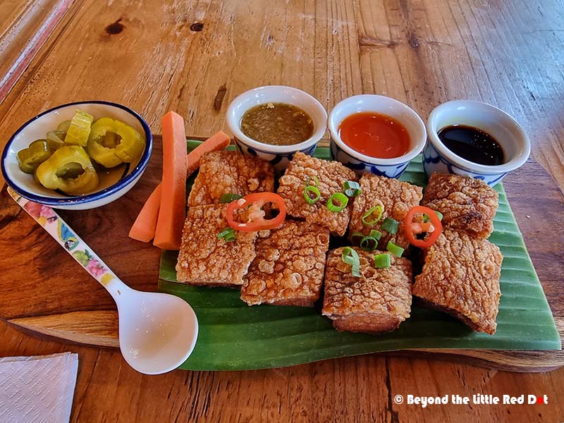 I wasn’t intending to order khao soi again but after looking through their very extensive menu, I picked khao soi with chicken for familiarity and a side dish of roasted pork belly. I couldn’t pass up the opportunity try some roasted pork bellies which Thailand is also very well known for.