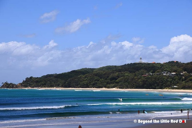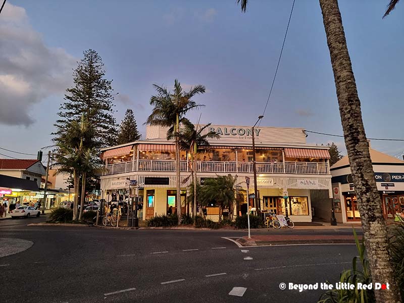 Byron Bay exudes the typical Australian small town vibe. Quaint buildings line the narrow streets. But here they have been given over to commercialism with shops, bars, and restaurants catering to the tourists.One of the more well known establishments is the Balcony. This restaurant is at one of the main street corners and offers balcony sitting while you eat. Get here early if you want the balcony seats with street views, or make a reservation.I could see the lighthouse from the beach at Byron Bay. As you can see, the lighthouse is quite a distance away (2 km in a straight line and 3.6 km by hiking)