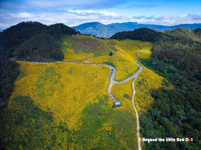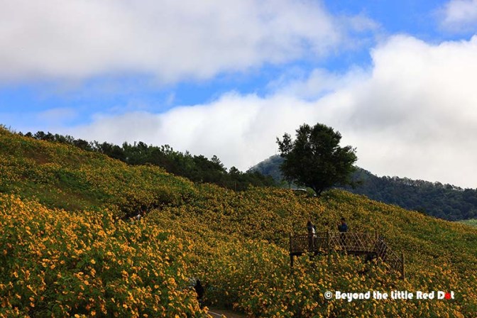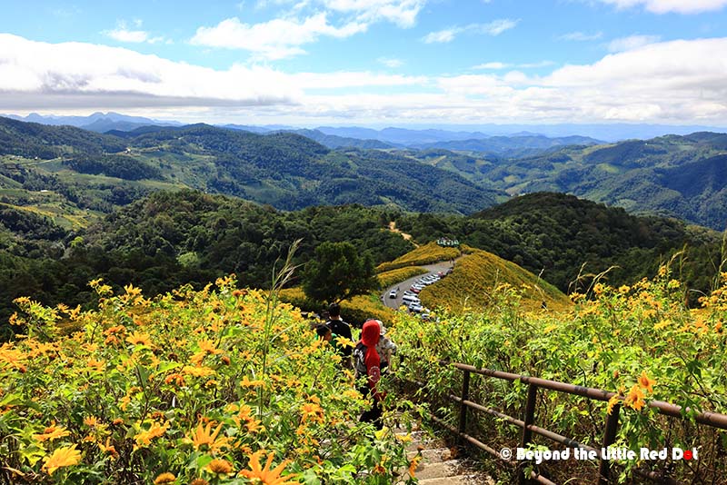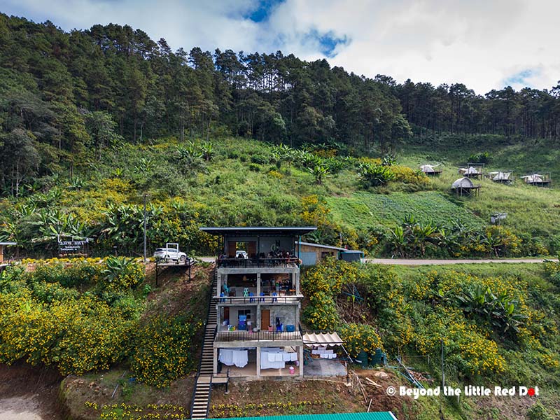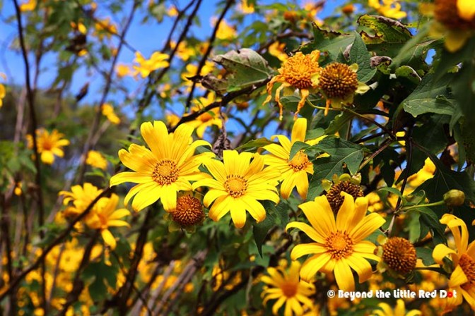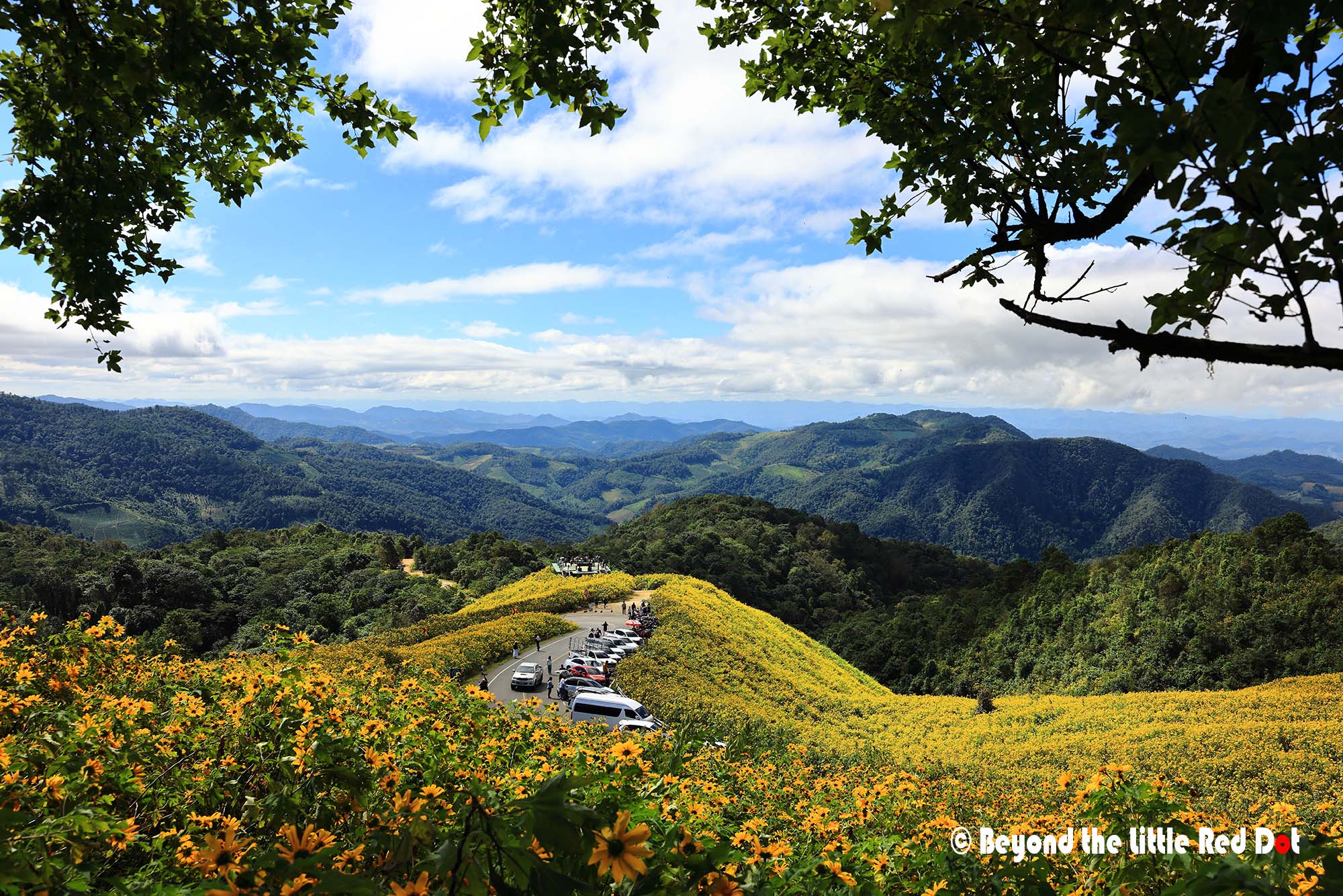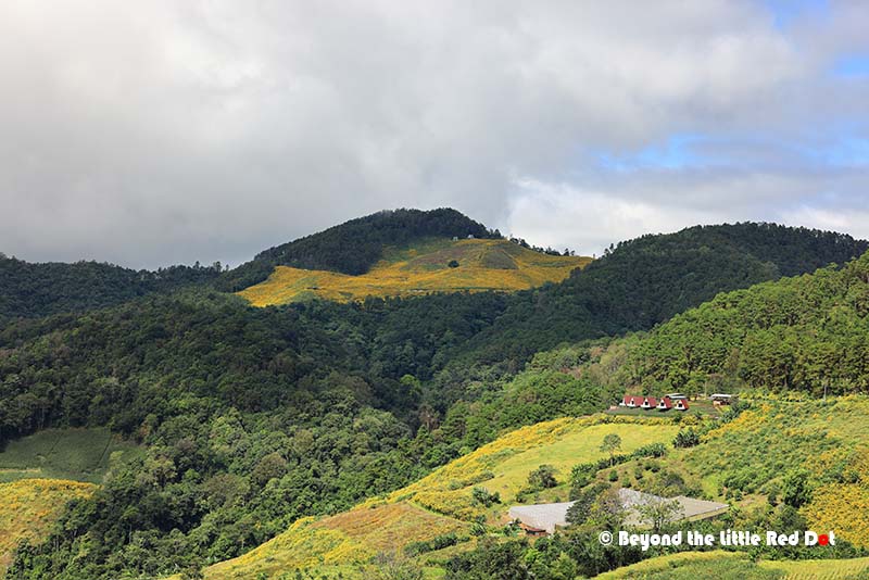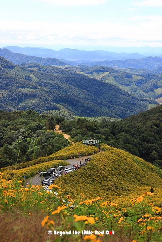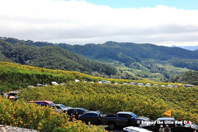 I’ve seen patches of these yellow flowers growing wild along the roadside while driving along the Mae Hong Son Loop. However, at Doi Mae U Koh, they are grown in large fields confined to a certain area. The Mexican Sunflower, known as Thung Bua Tong in Thai, is not native to Thailand and is an invasive species of plant that was introduced to Thailand decades ago. They thrived in the cool highland climate of Mae Hong Son, and over time, the spectacular seasonal bloom typically from mid November to early December, turned these hills into a celebrated winter attraction, now promoted as one of the region’s signature natural sights. What was once just a remote highland slope is now a protected area and festival site, with simple facilities, viewpoints and camping options for visitors who want to wake up right beside the fields